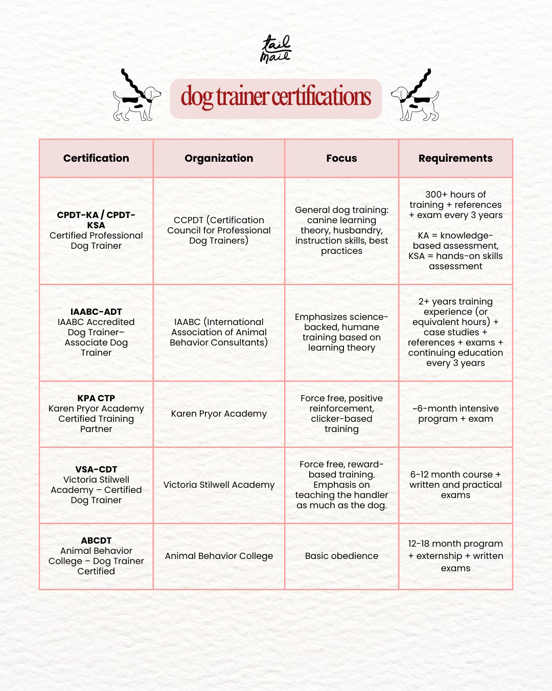 Do you have training certifications? Training isn’t regulated in the U.S., so anyone can call themselves a trainer, behaviorist, dog expert, etc. A good trainer should be proud to discuss their experience and educational background, which may include widely recognized certification programs that require hours of hands-on experience and written exams. Not all certifications are made equally, so I wouldn’t make a decision solely based on whether a trainer has or doesn’t have one of the common certifications included in the cheat sheet below. (If you’re in need of a dog behaviorist, however, credentials are absolutely important. More on that later.)