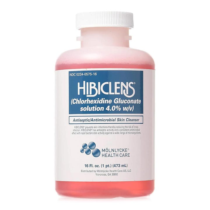 Pour a splash of chlorhexidine into a tall plastic tub (like an old deli soup container) and fill to the top with warm water.
